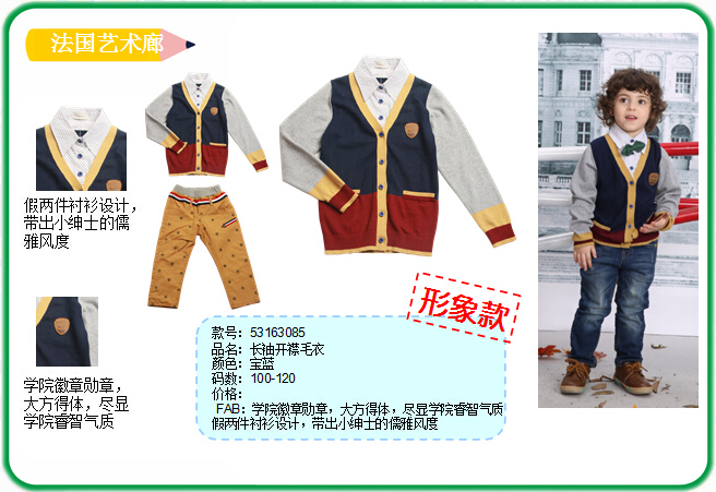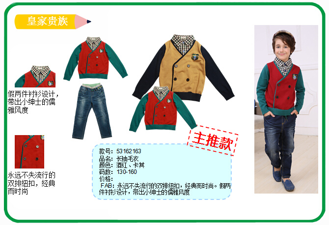 推薦理由:單排扣紐毛衣假兩件設(shè)計(jì),盡顯學(xué)院氣息,搭配牛仔或休閑褲帶出紳士風(fēng)度