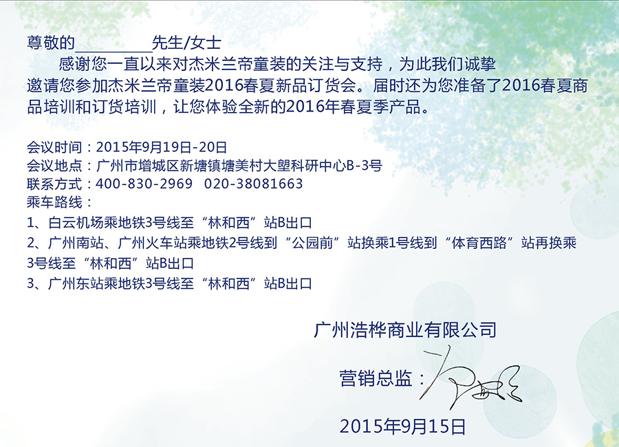 金色秋季,杰米蘭帝品牌童裝2016“蟬·變”春夏新品訂貨會(huì),盛大綻放。為感謝廣大加盟商對(duì)廣州浩樺商業(yè)有限公司旗下品牌“杰米蘭帝”的厚愛與支持,為此我們誠(chéng)摯的邀請(qǐng)您參加杰米蘭帝童裝2016春夏新品訂貨會(huì)。屆時(shí)將展示杰米蘭帝品牌2016“蟬·變”的魅力。