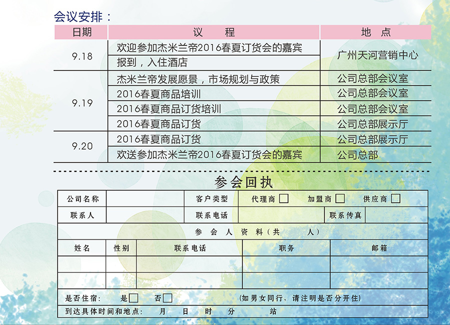 此次訂貨會(huì)我們?yōu)槟鷾?zhǔn)備了2016春夏新品展示及訂貨銷售培訓(xùn),現(xiàn)場(chǎng)進(jìn)行商品訂貨。讓您全新體驗(yàn)杰米蘭帝2016春夏季產(chǎn)品,共享這場(chǎng)時(shí)尚“盛宴”。