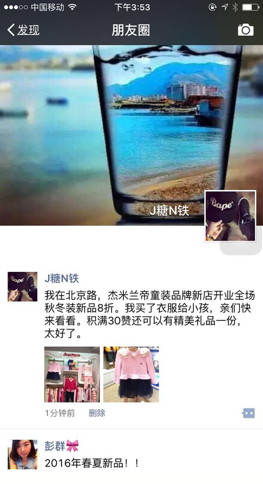 如:我在XXX路,杰米蘭帝童裝品牌新店開(kāi)業(yè)全場(chǎng)秋冬裝新品8折。我買(mǎi)了衣服給小孩。親們快來(lái)看看。積滿(mǎn)30贊還可以有精美禮品一份,太好了。