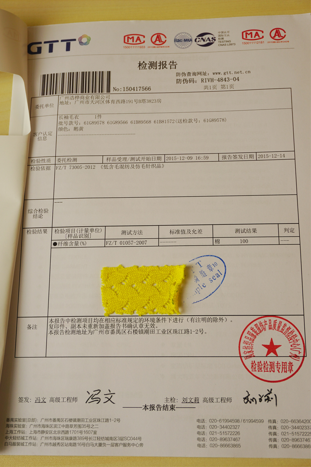 廣州纖維產(chǎn)品研究所是國家紡織品服裝服飾產(chǎn)品質(zhì)量監(jiān)督檢驗(yàn)中心(廣州)作為全國一流的檢測(cè)實(shí)驗(yàn)室,GTT擁有雄厚的技術(shù)力量、先進(jìn)的檢測(cè)設(shè)備、出具的檢驗(yàn)報(bào)告不但成為企業(yè)進(jìn)行纖維、紡織品、服裝服飾等貿(mào)易和內(nèi)部質(zhì)量控制的技術(shù)依據(jù),同時(shí)也成為法院、質(zhì)量技術(shù)管理部門、工商行政管理部門、保險(xiǎn)公司等做出司法判決、行政處罰或保險(xiǎn)理賠的技術(shù)支撐。