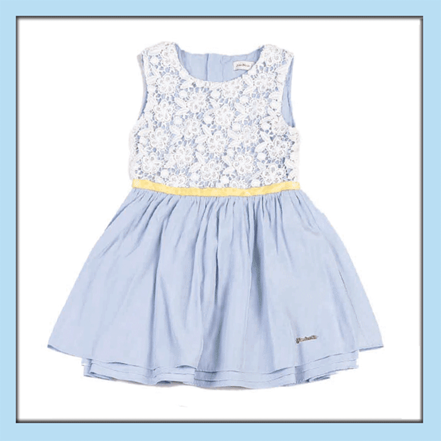 時(shí)下流行色彩馬卡龍藍(lán)連衣裙,搭水晶涼鞋,同色系裙擺層次鮮明,清新而不跳脫,閃亮的明星寶貝!